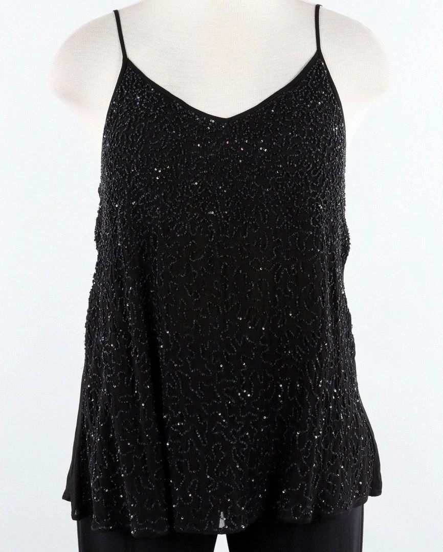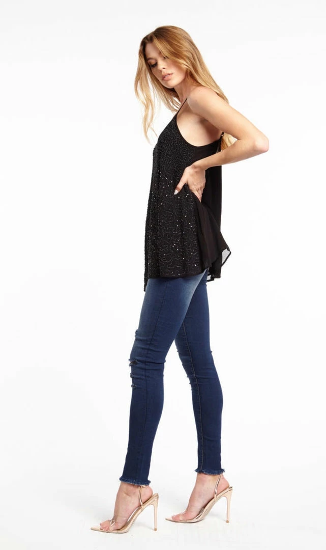 Hand beaded cami, adjustable straps, sheer back, beaded front with a v neckline.