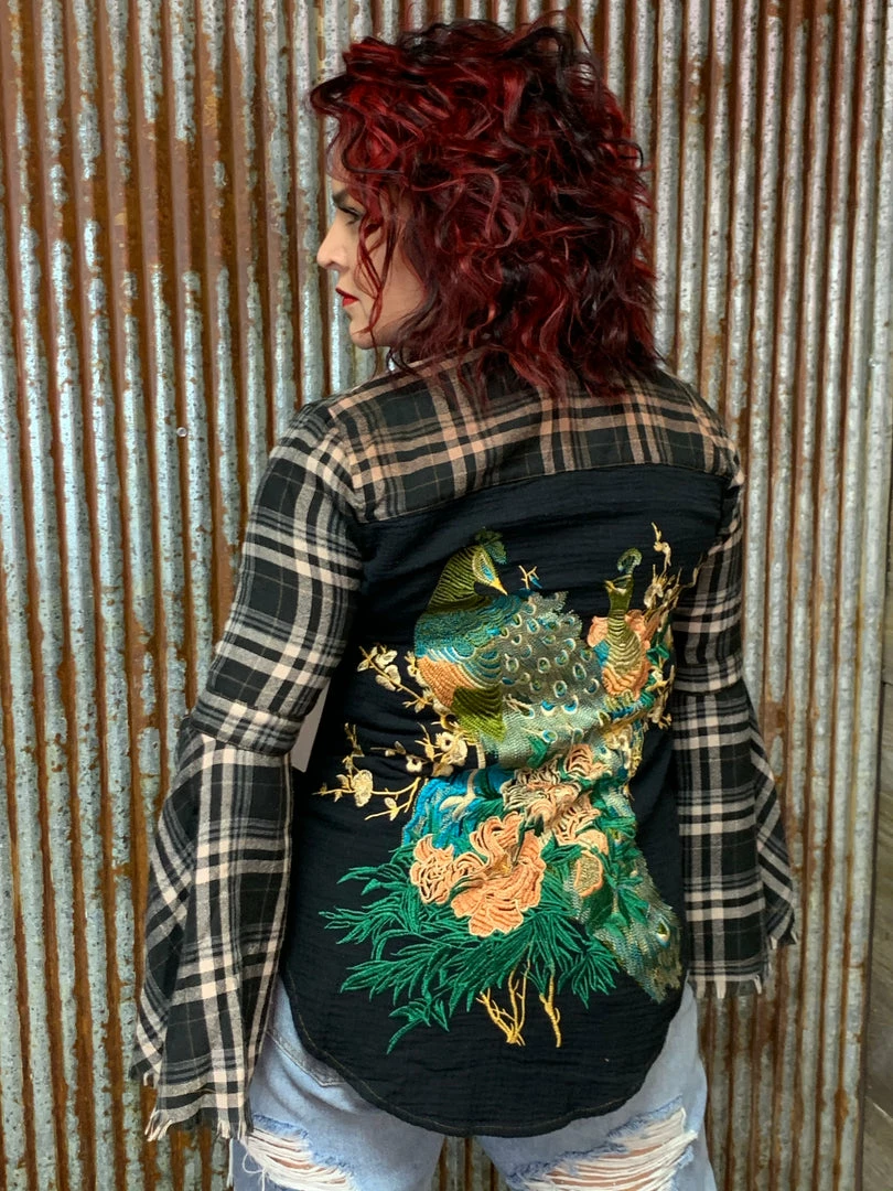 Isabella bell plaid shirt, bell sleeves with frayed edges. Β The back is absolutely beautiful embroidery of two peacocks.