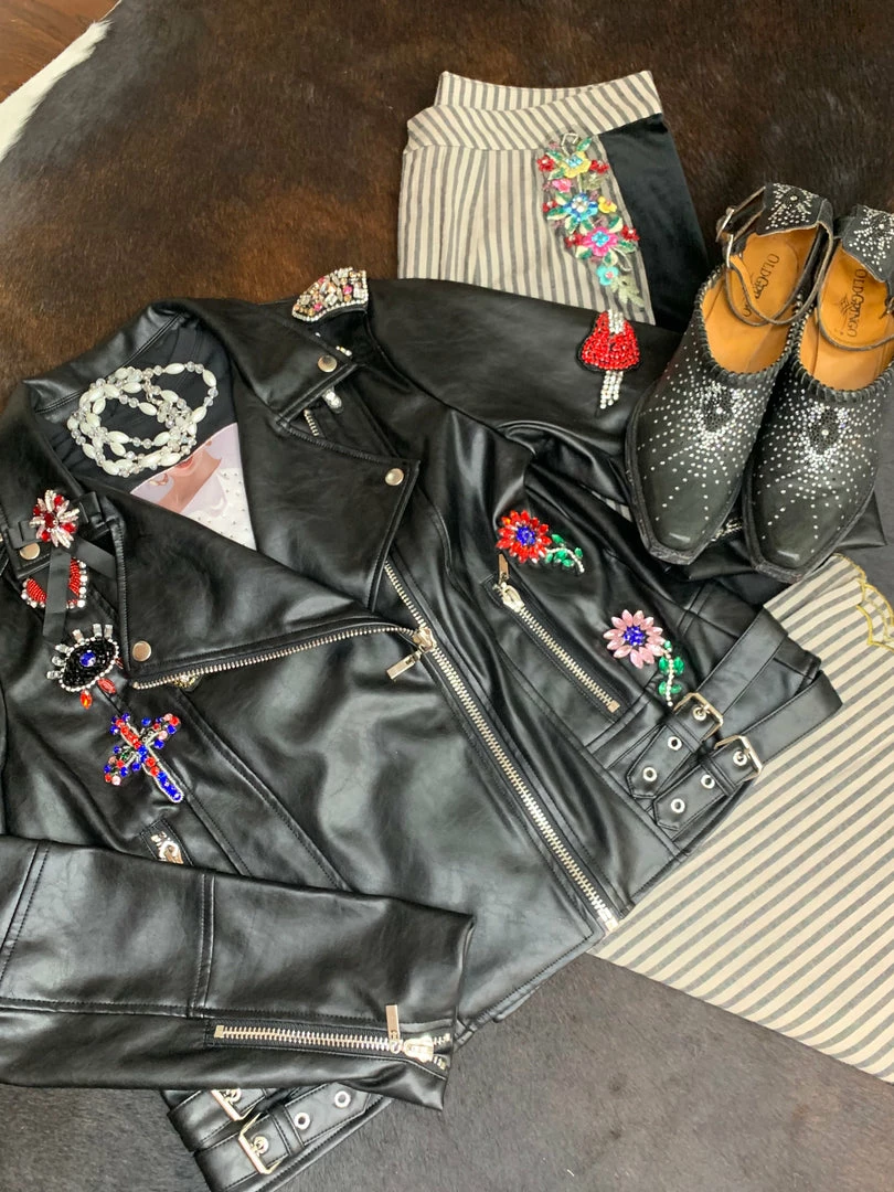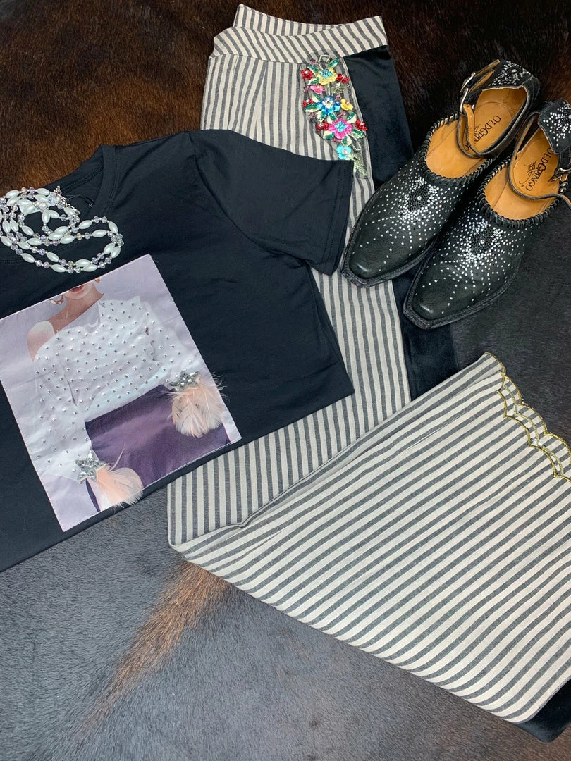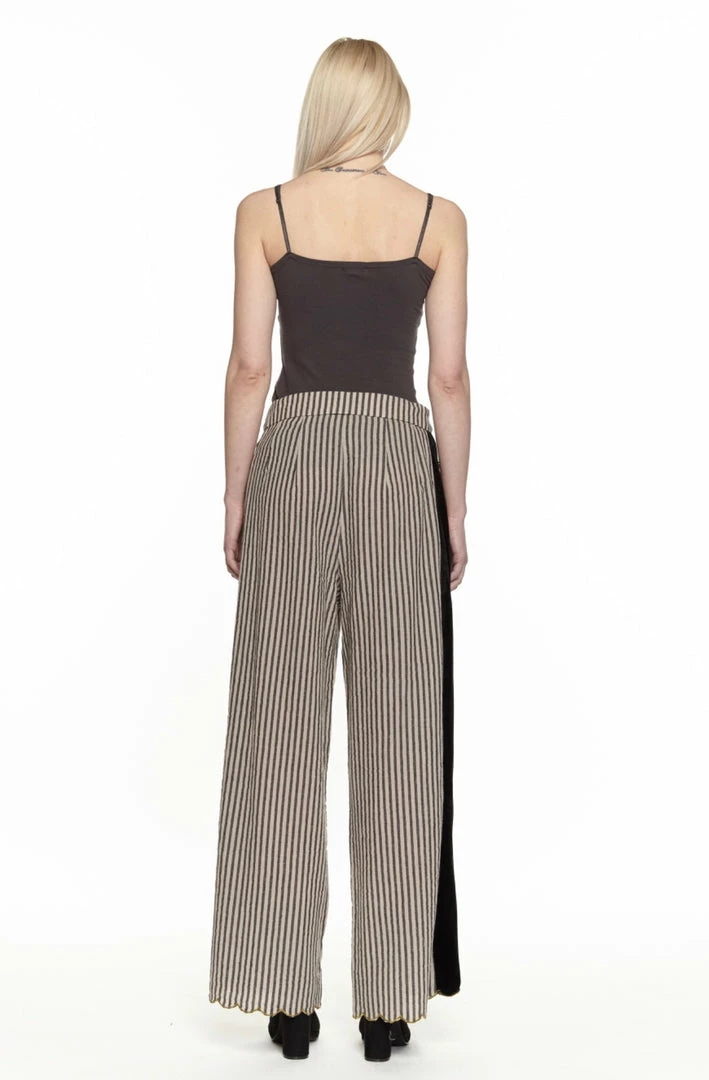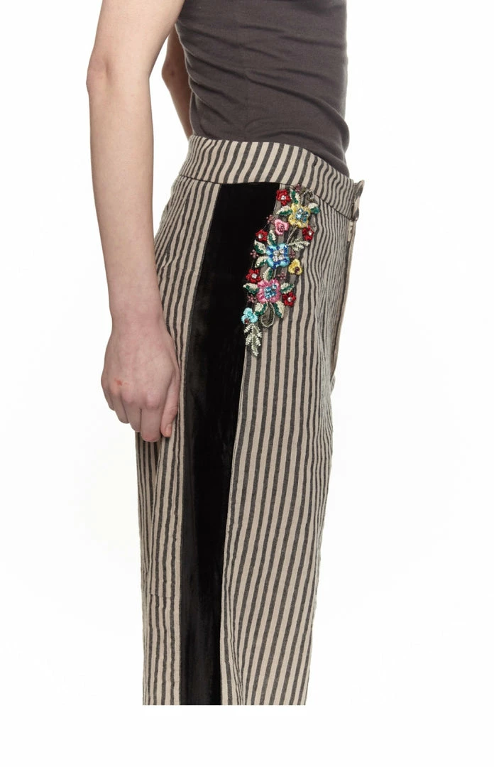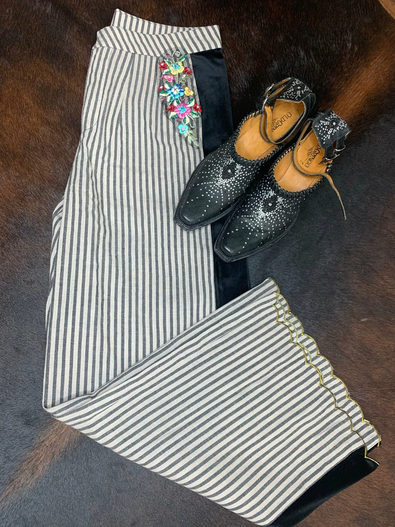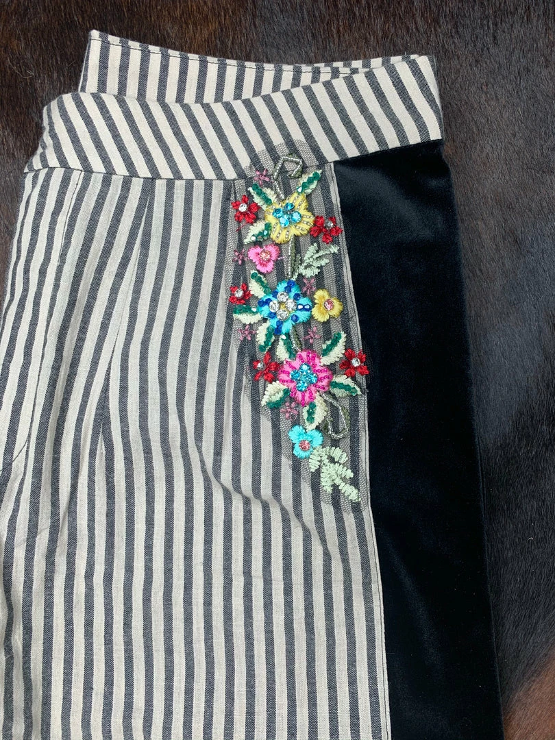 Striped pants, add velvet, some floral metallic embroidery with sparkly stones and a scalloped edge.