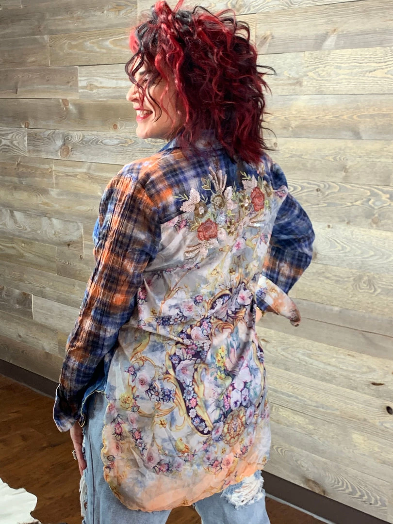 Plaid shirt printed back. Β Beautiful embroidery and sequins.