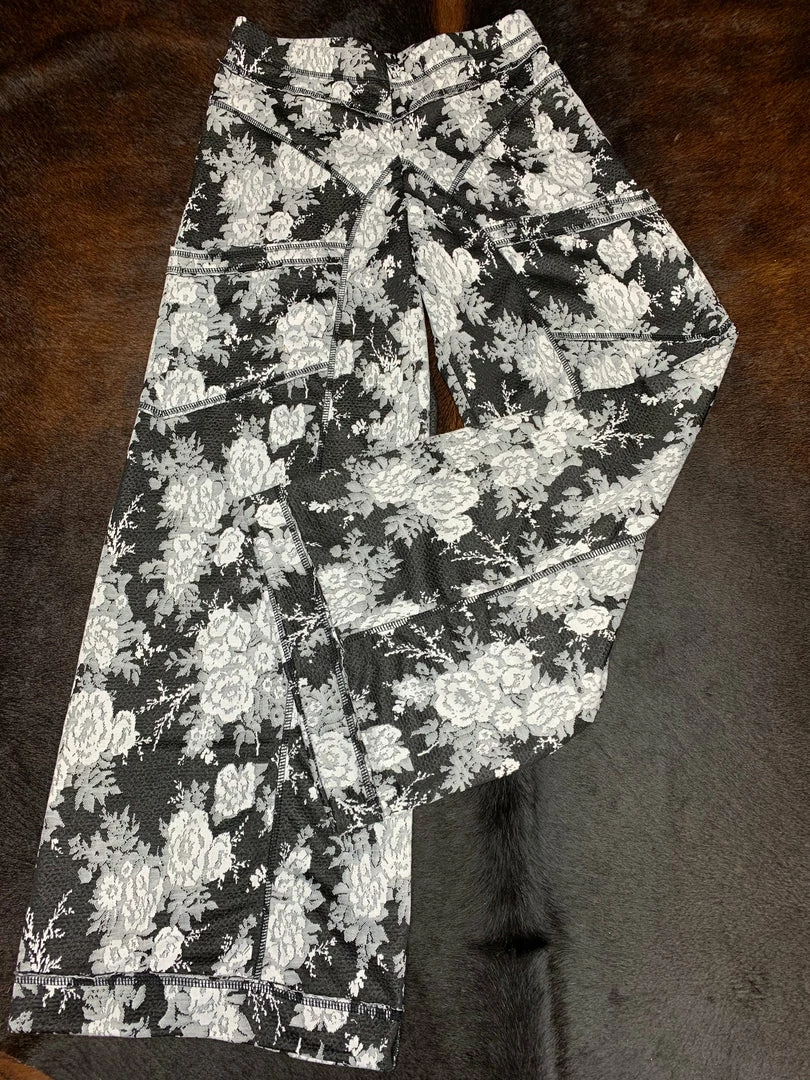 Daphne pant is constructed from a wick away synthetic print, 16 panels serged together then cover stitched in contrasting thread featuring large pockets.