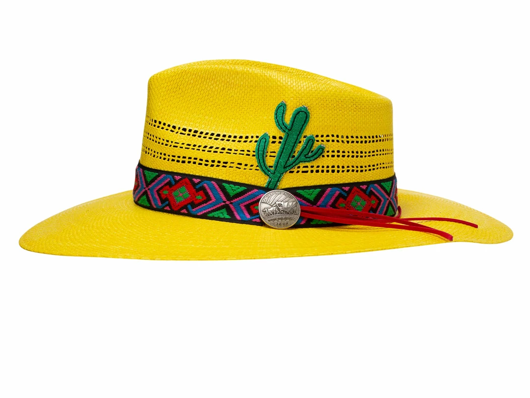 - The yellow straw hat features a 4 inch pinch front crown, 3 3/4 inch brim, fire branded “C” logo on the crown and multicolored stitched fabric hatband with a silver coin and cactus patch.
