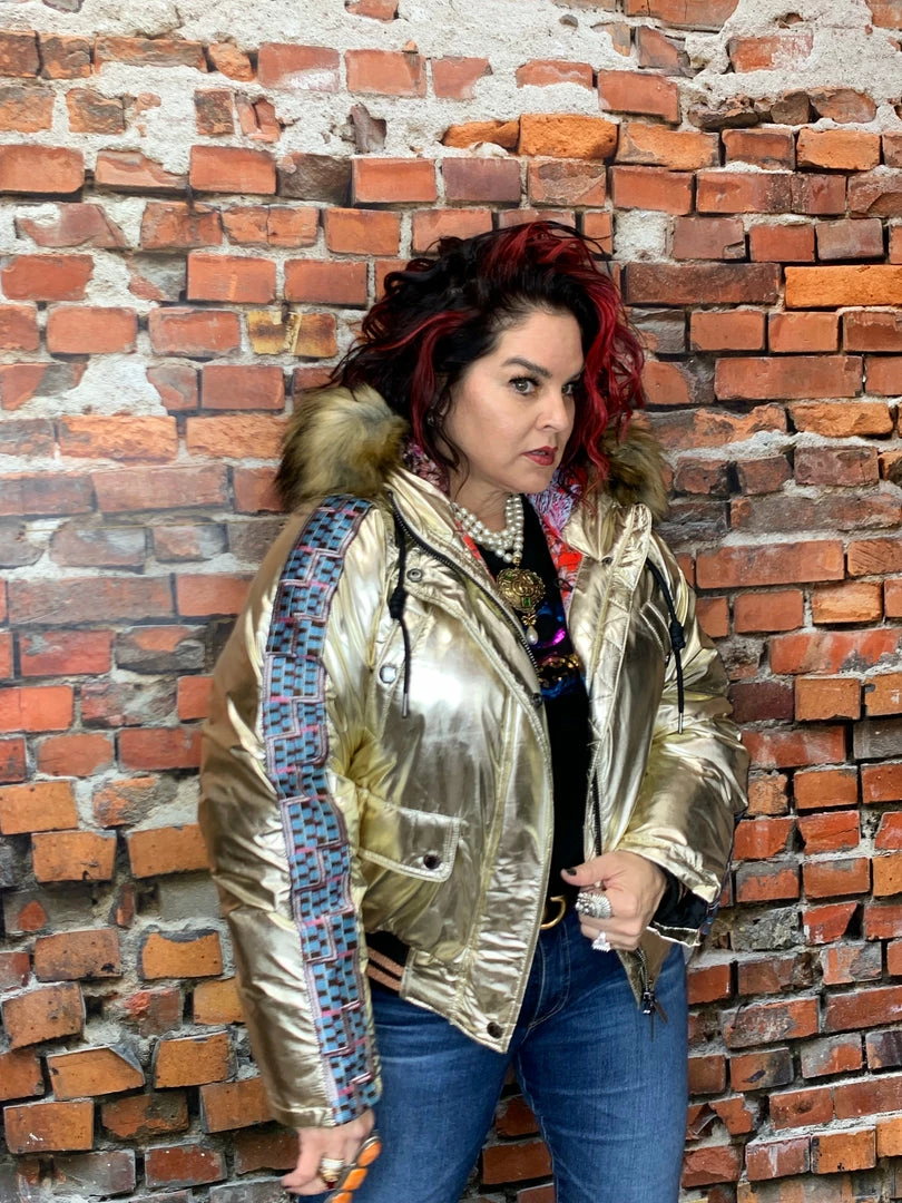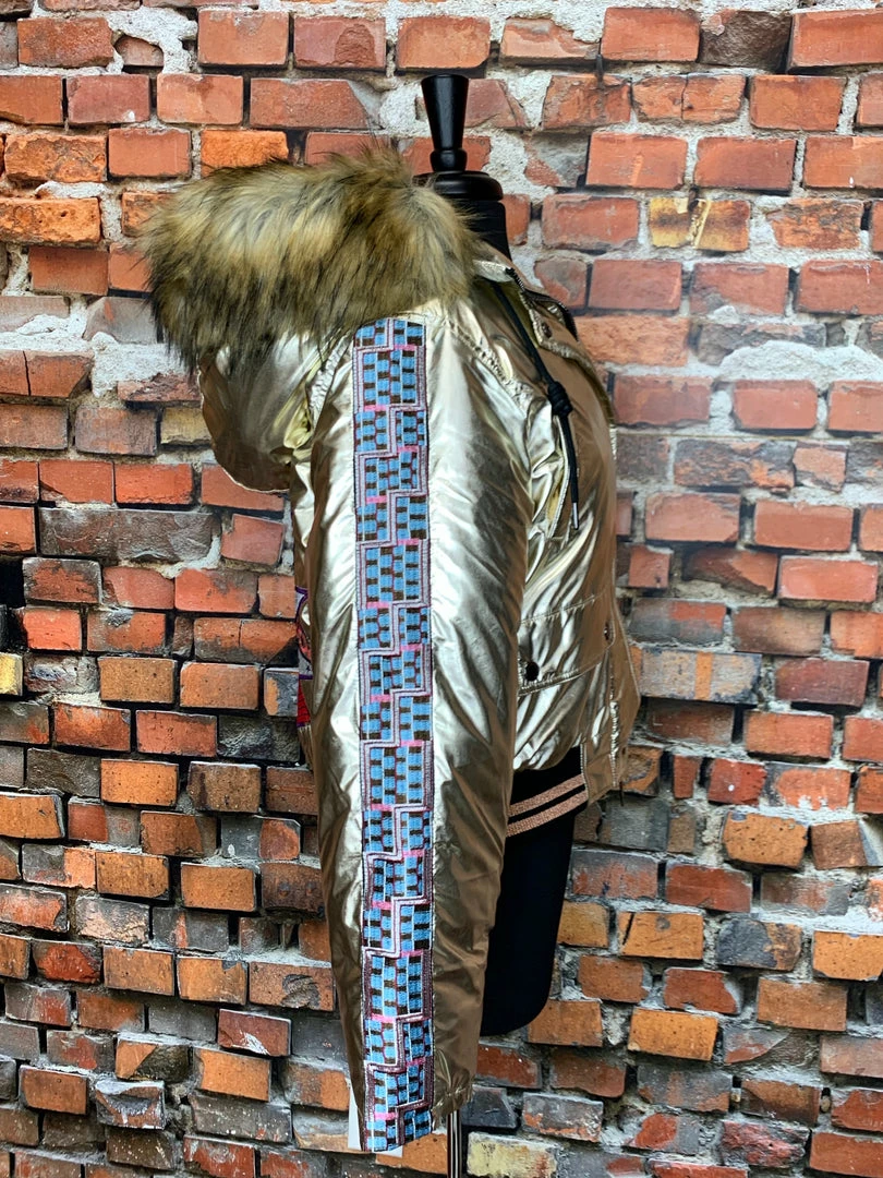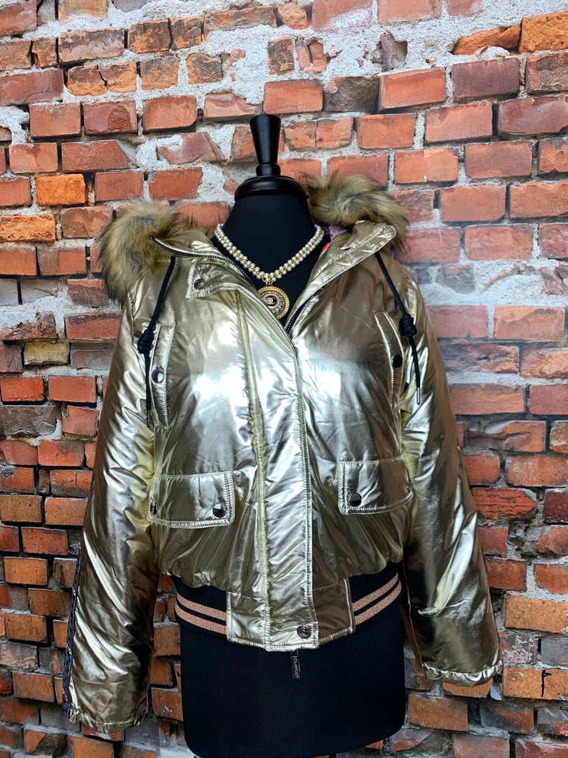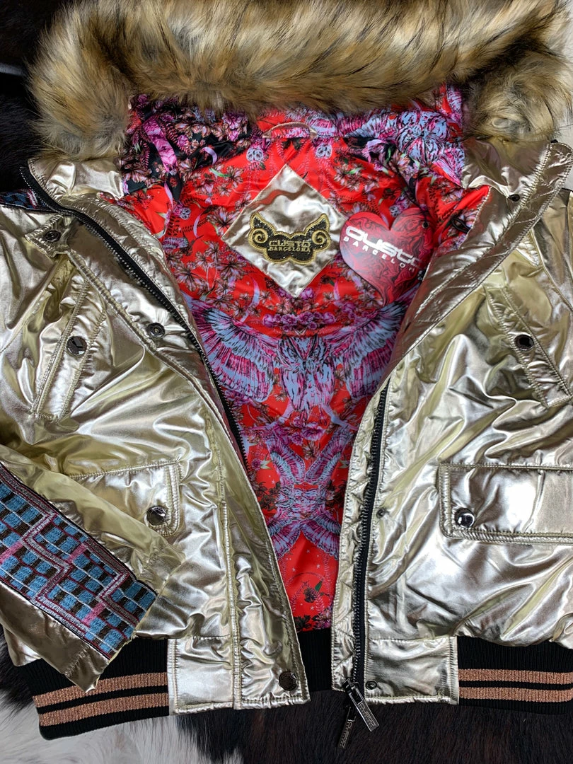 Designed in Spain by Custo Barcelona. Β Shiny gold metallic with beautiful embroidery on sleeve and the back of jacket. Β Hood with faux fur. Β The 36 fit me perfect and in US sizing I wear a medium and or a 8/10