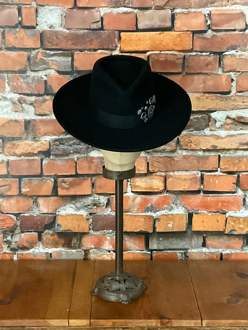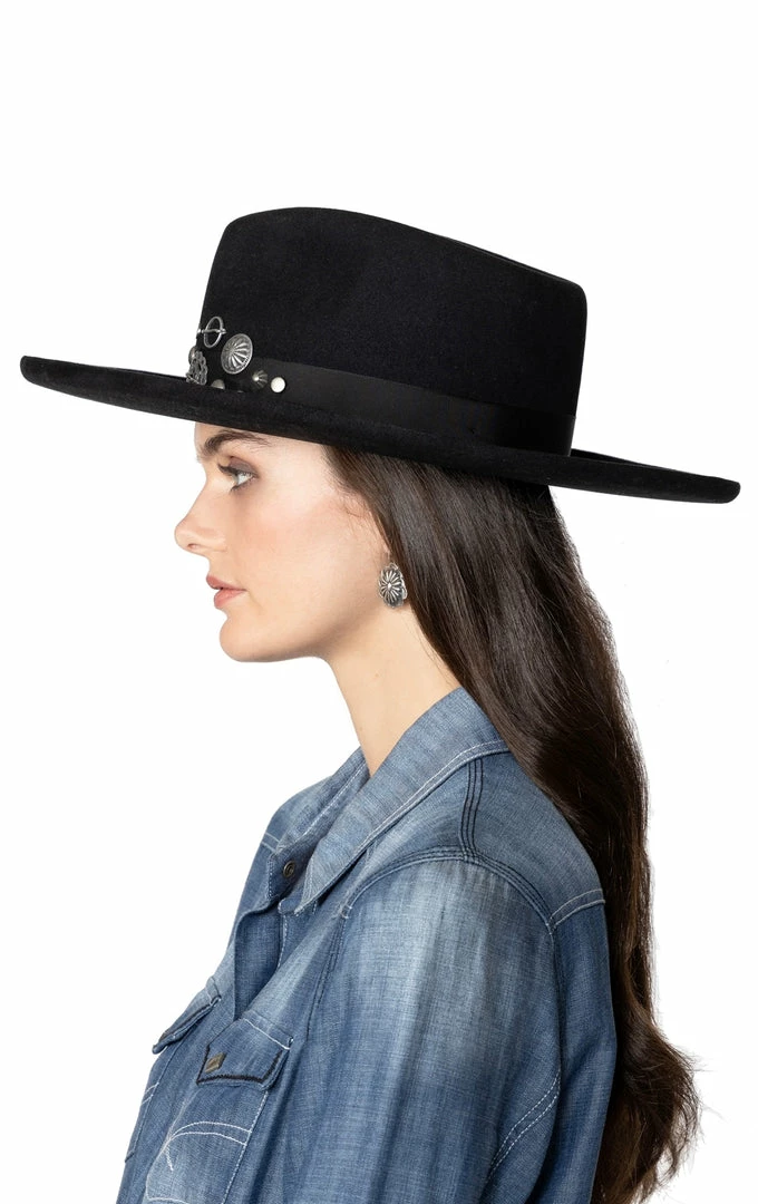 The Trade Silver Hat is a chic statement-but-staple necessity for your millinery. It has a subtle pinched-front crown and a wide pencil-rolled brim, and the tonal grosgrain hatband is adorned with custom DDR findings inspired by antique trade silver pieces. Stunning!