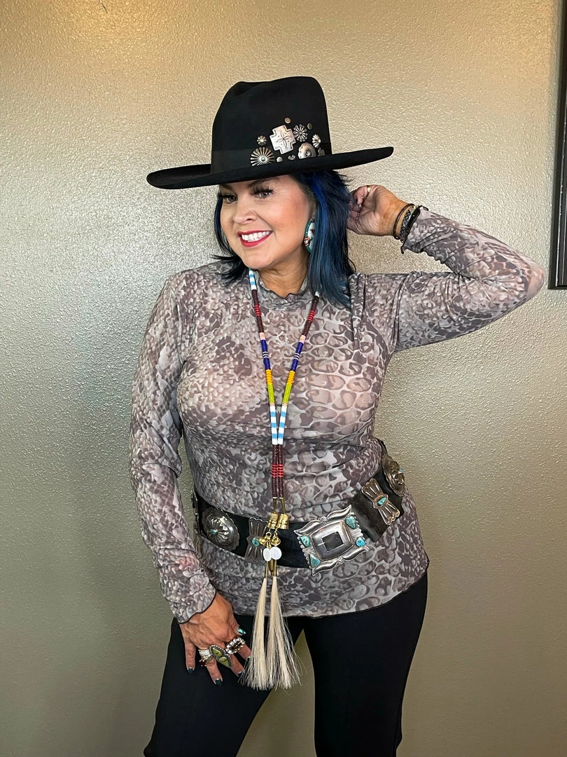 ย We did a lot of cheetah and cowhide in recent collections, and for Grand Canyon weโre bringing you some snazzy snakeskin! This lightweight, long-sleeved top is a custom DDR snakeskin print with a flirty feminine collar. Throw it on and load it up with jewelry!