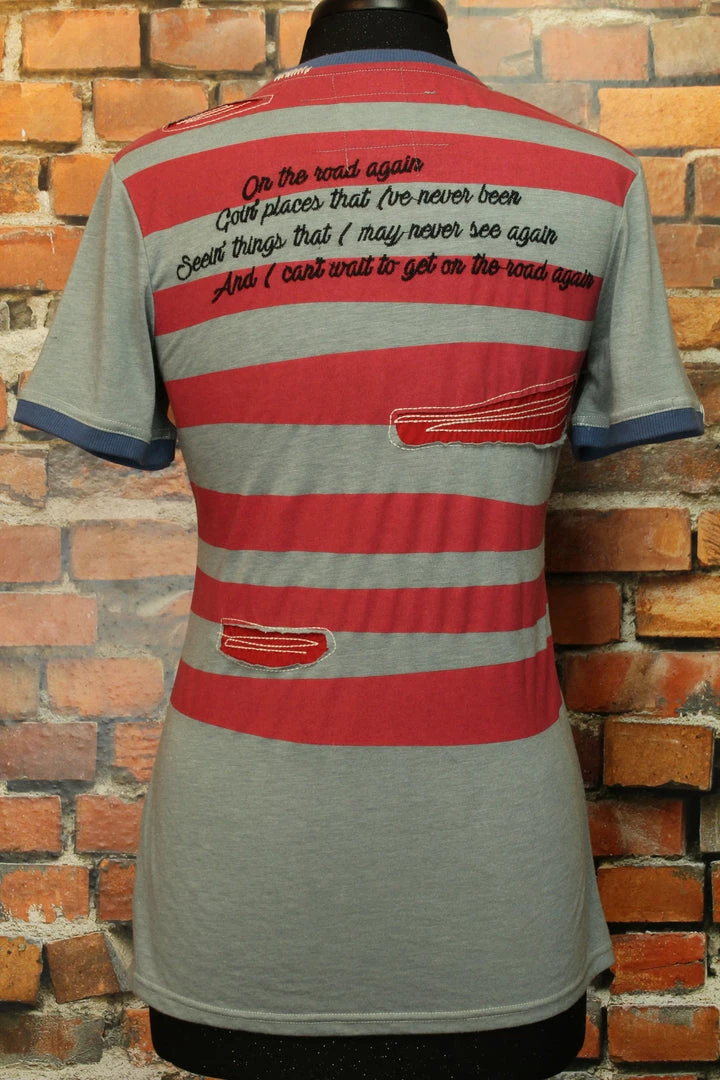 It’s a classic old school silhouette with ringed collar and sleeve, and features a print graphic image reminiscent of the ‘70s-‘80s era. The back also features asymmetrical stripes across it, so you’re making a statement coming and going!
