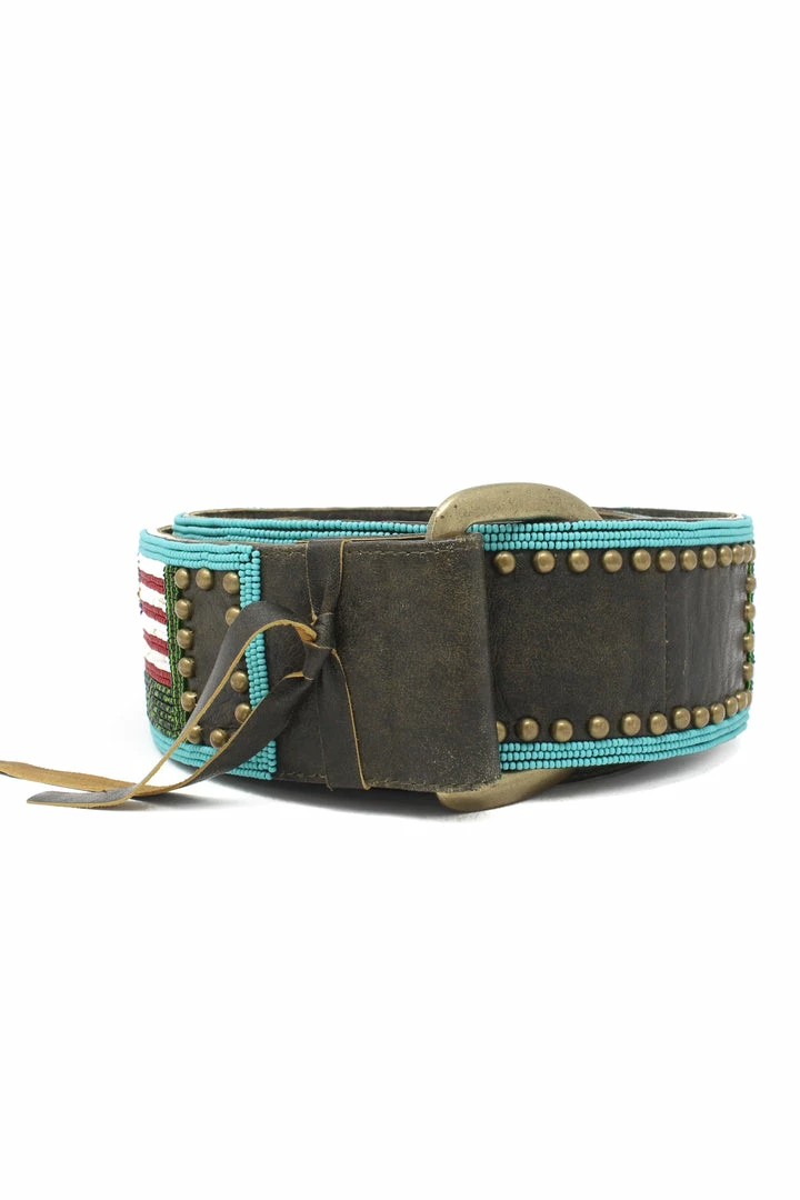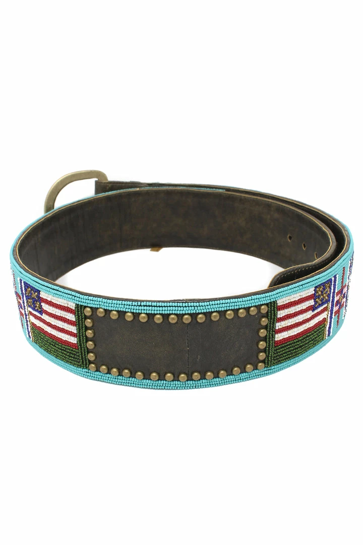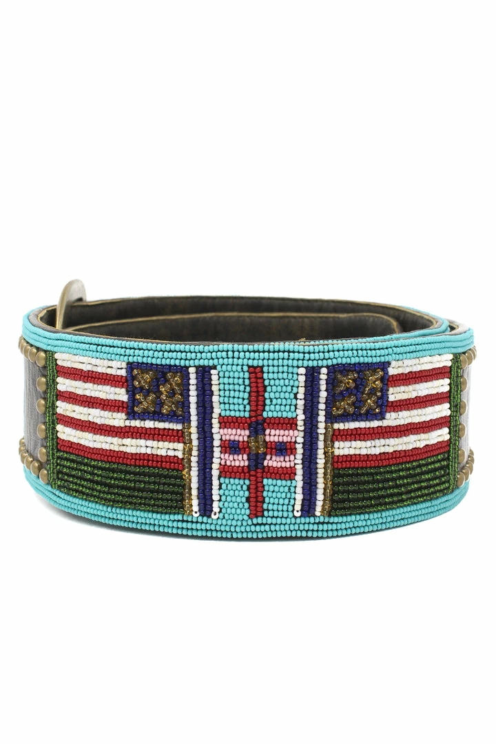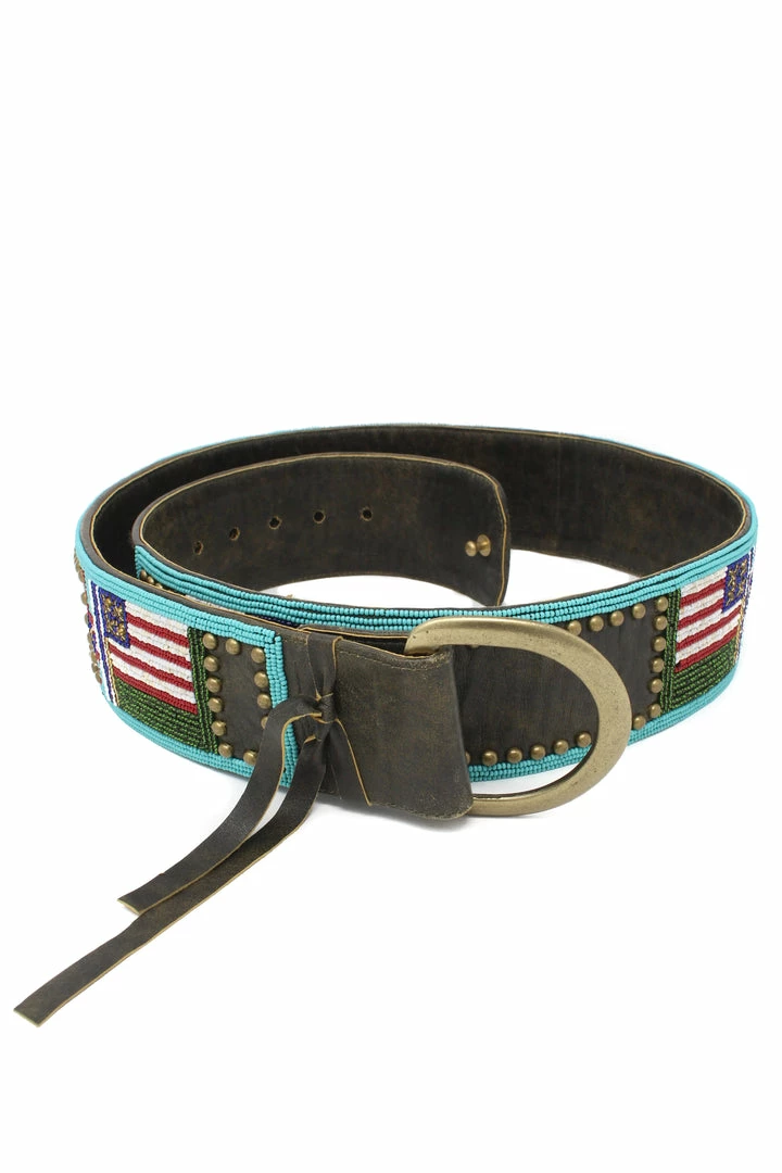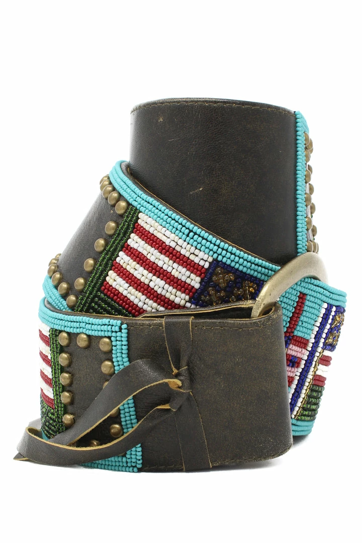 Beaded belt with American flag design and D buckle.