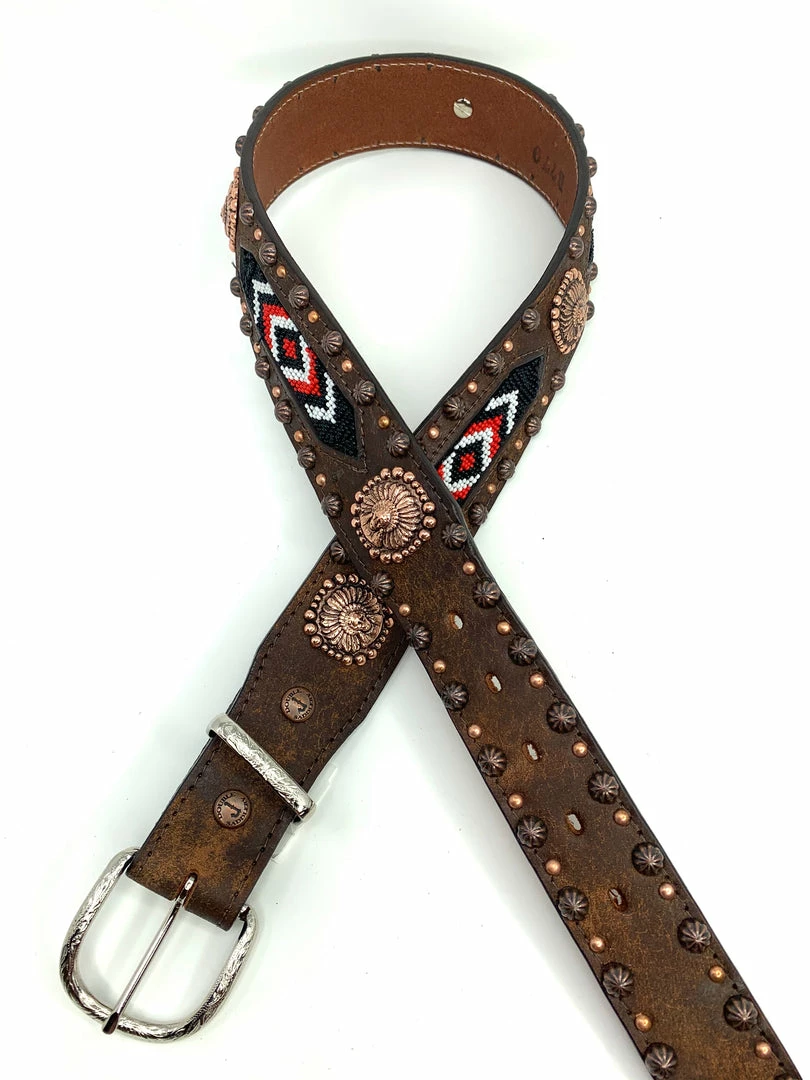 Vintage belt with a beaded inlay.ย Alternating antique copper engraved dots and small copper dots along the edgesย Accented with antique copper indian head conchos.