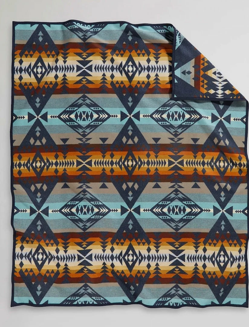 Diamond Peak in Central Oregon is a slumbering shield volcano that rises to an elevation of nearly 9,000 feet. It last erupted 10,000 years ago, making it dormant, perhaps extinct. This pattern’s peaks and valleys echo the landscape, part of the Pacific Crest Trail and ancestral territory of many Oregon tribes, including the Klamath, Modoc and Yahooskin peoples. Crafted to last a lifetime, this blanket is woven from pure virgin wool in our Pendleton, Oregon, mill.