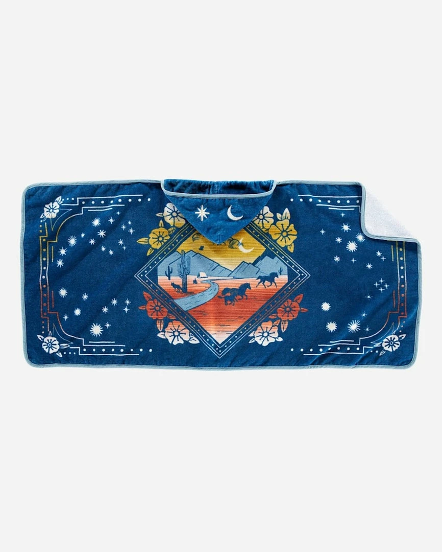 Dry off and cuddle wee ones with a cozy hooded kids’ towel in soft, thick cotton. Woven in a design of a desert at night, with a stallion, mare and colt galloping fast and free under the starry sky.