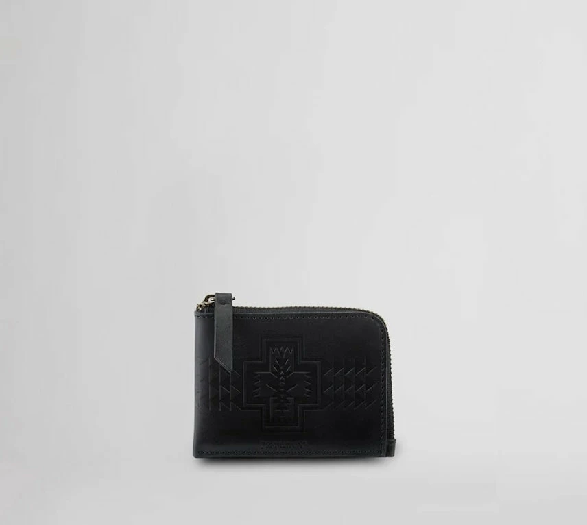 Zip-close wallet has an embossed pattern on front, with multiple card slots inside. Lined.