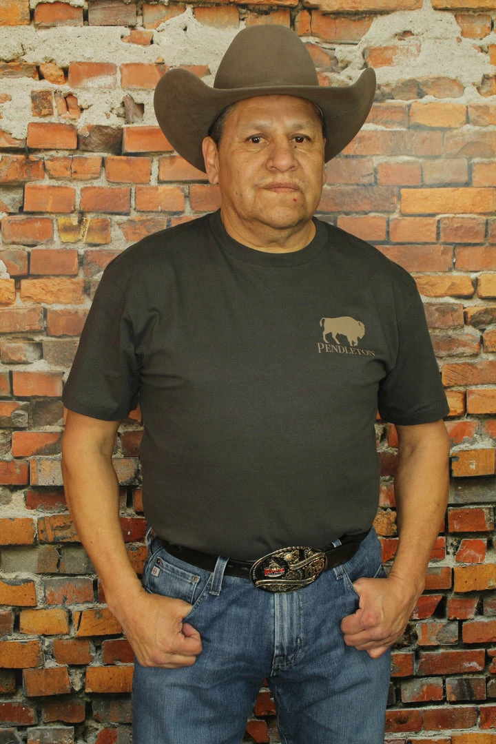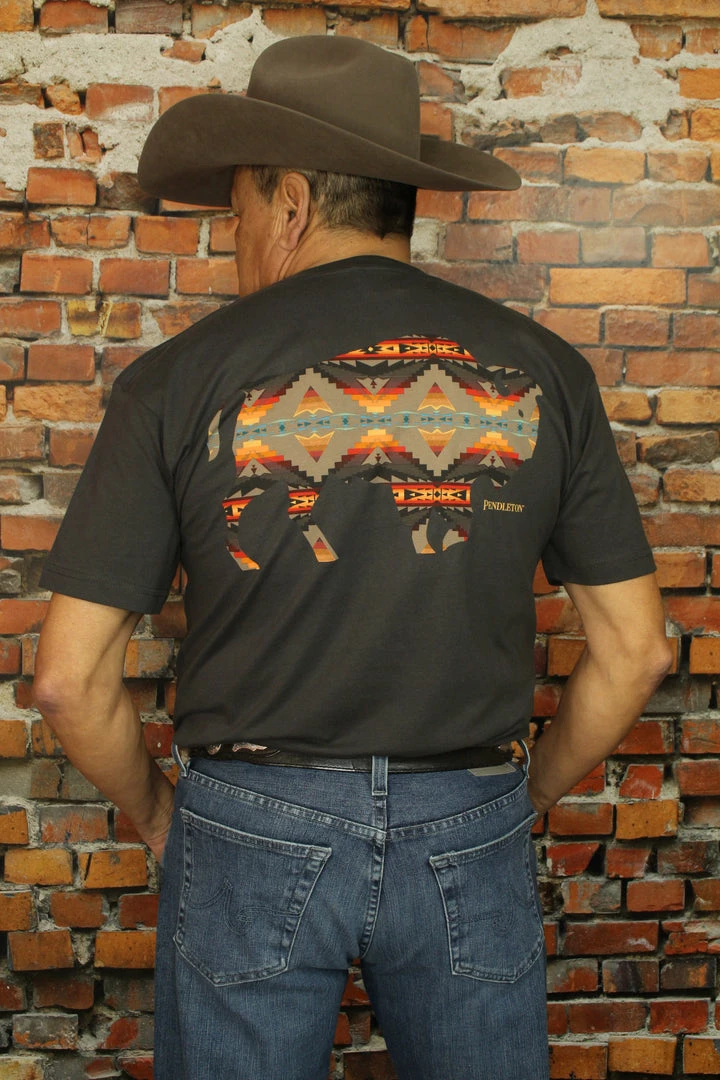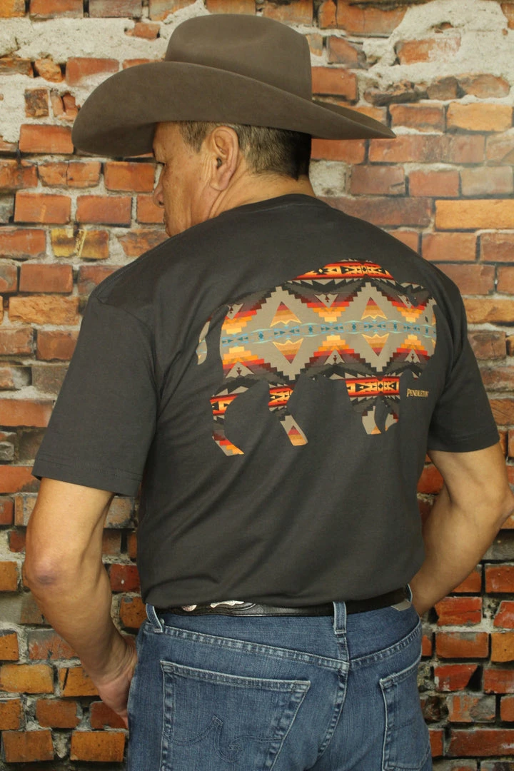 Men’s short-sleeve tee features a small bison emblem on front, and a large, colorful bison in our Sierra Ridge pattern on back. Pure cotton.