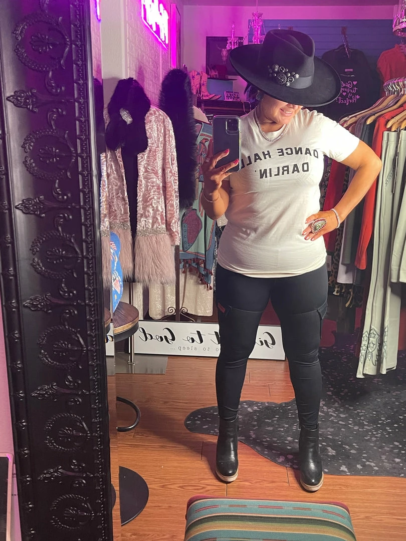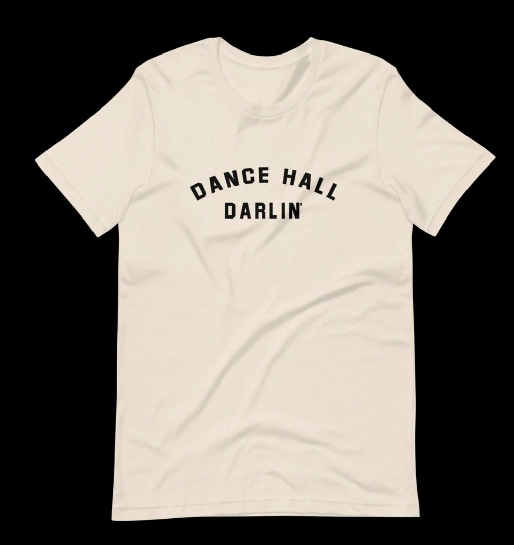 DANCE HALL DARLIN’ is printed on a Bella + Canvas 3001 unisex natural color tee.