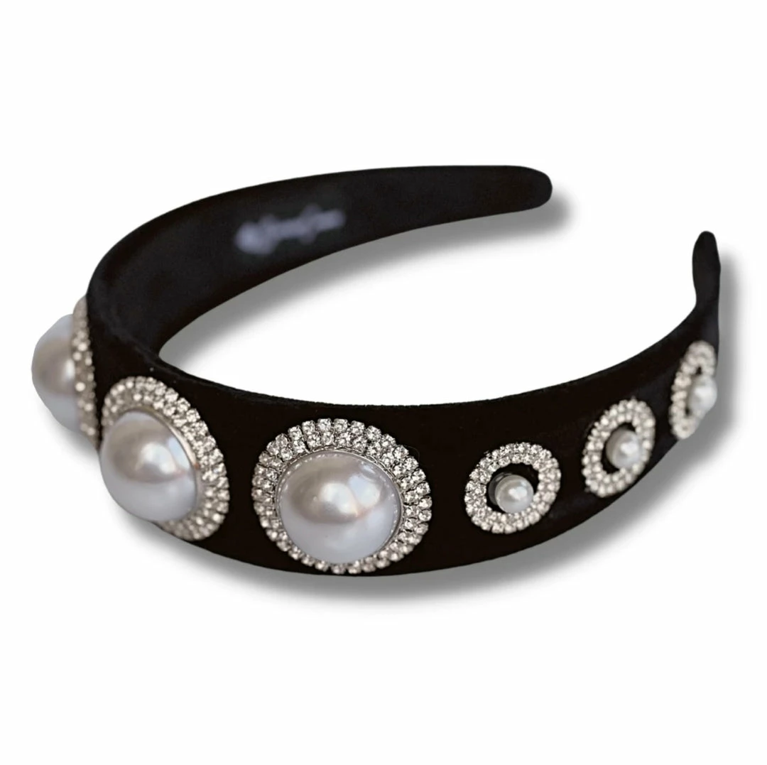 - Black velvet headband with jumbo resin pearls and rhinestone detail