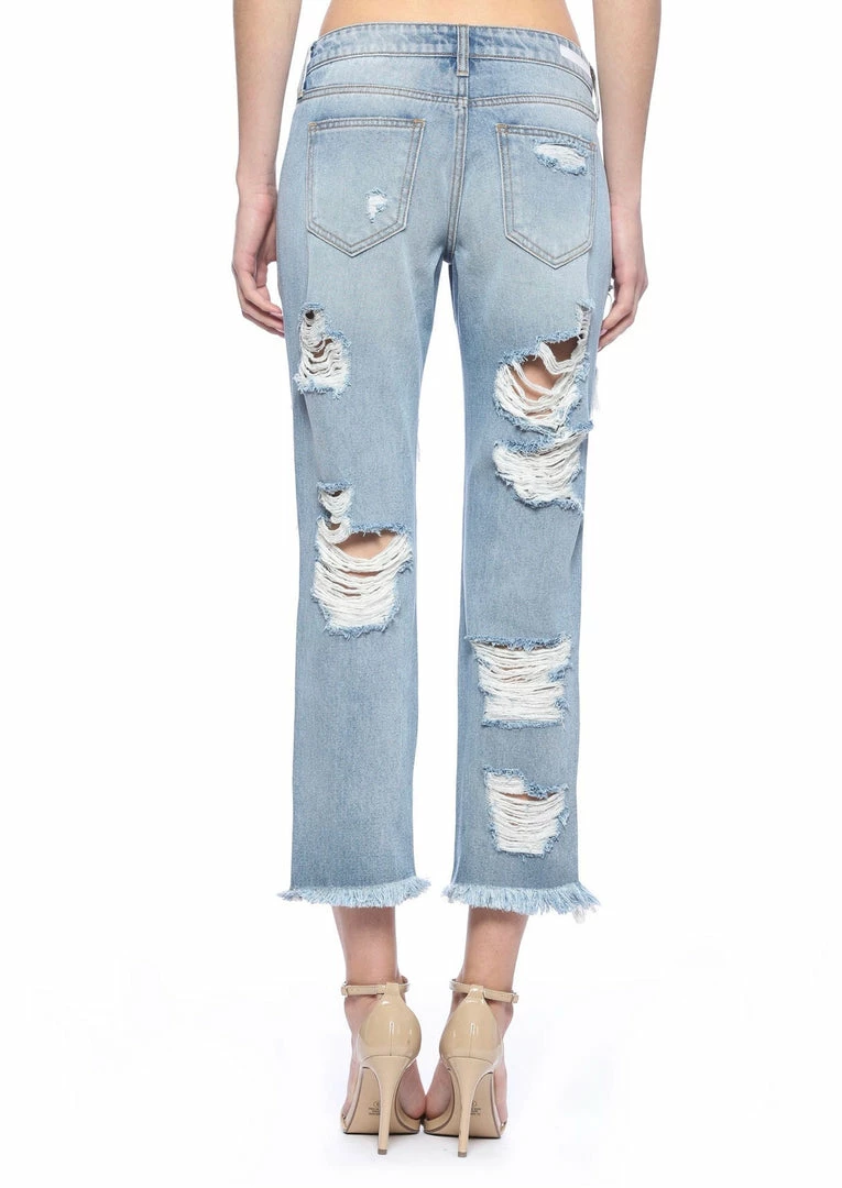 Beautifully balanced, these boyfriend jeans offer a comfy mid rise and slouchy fit. Their destructed detailing and light blue wash make them a must have.Β