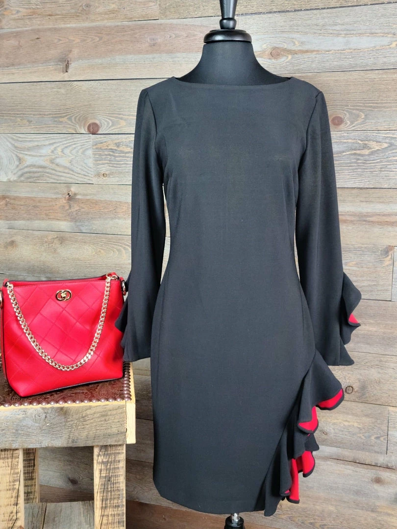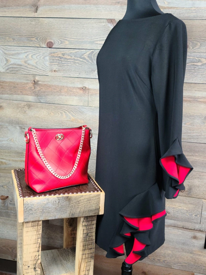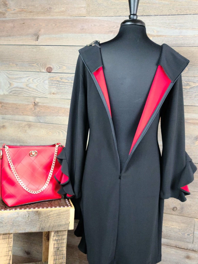 Simple with a flair!ย Black dress with red lining that is also exposed in the ruffles on the dress and sleeves.