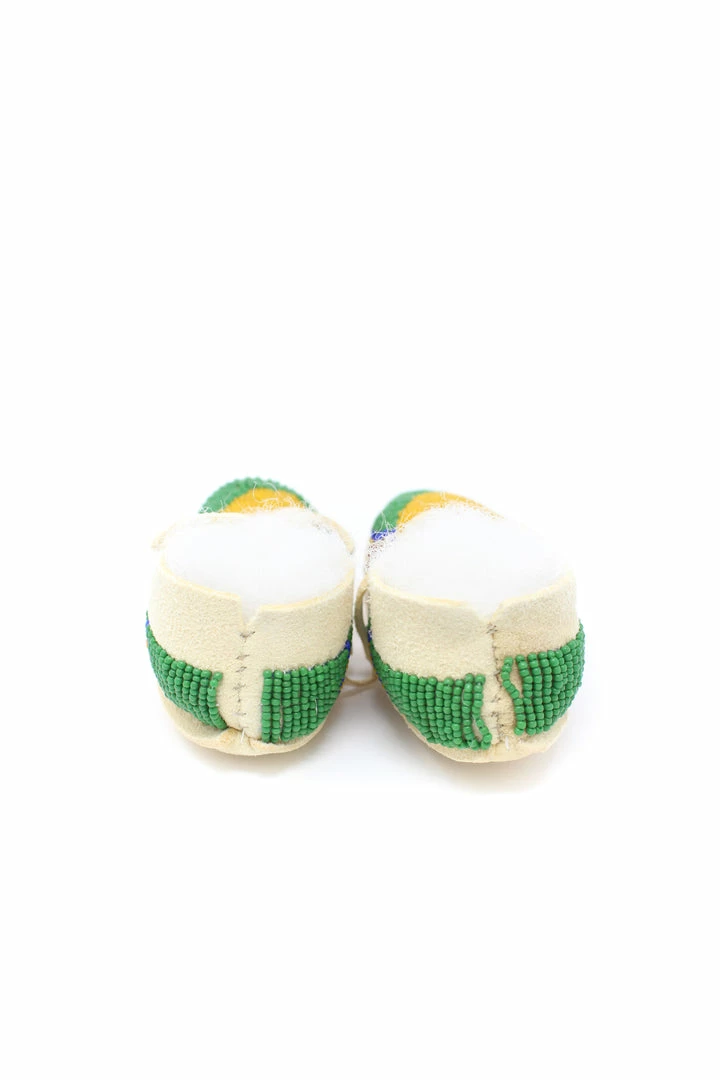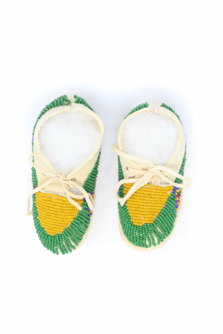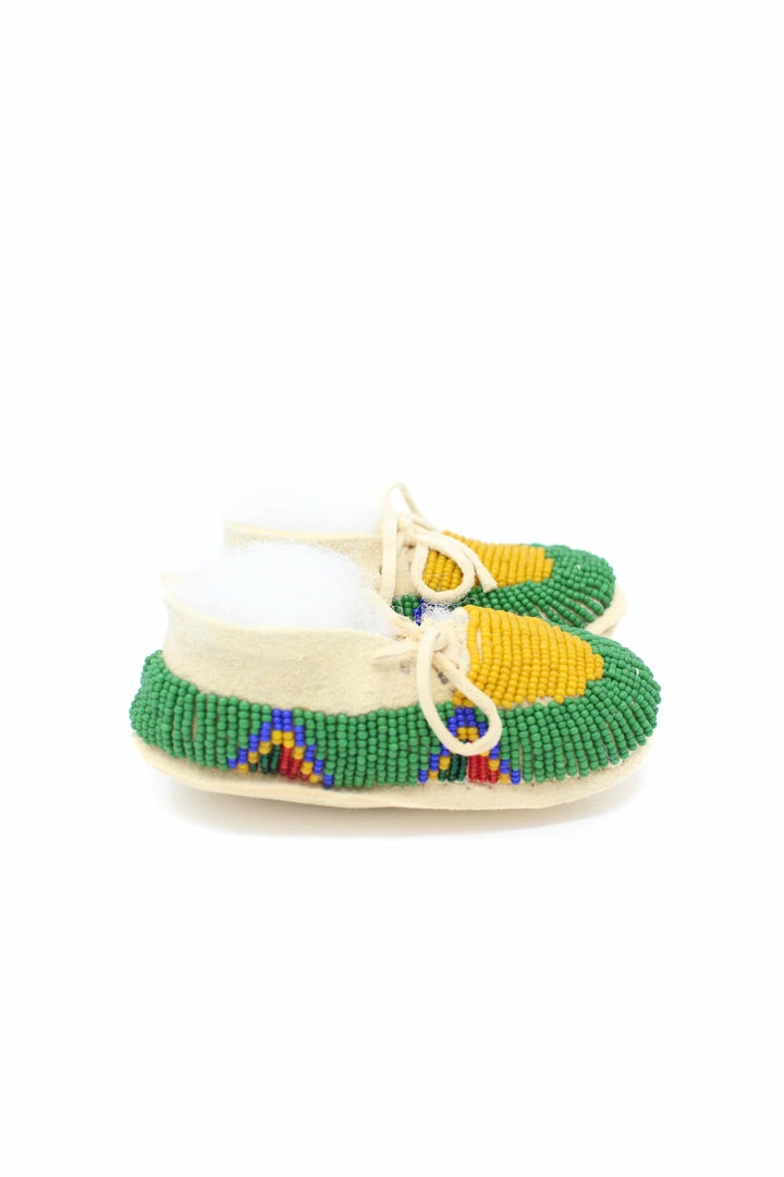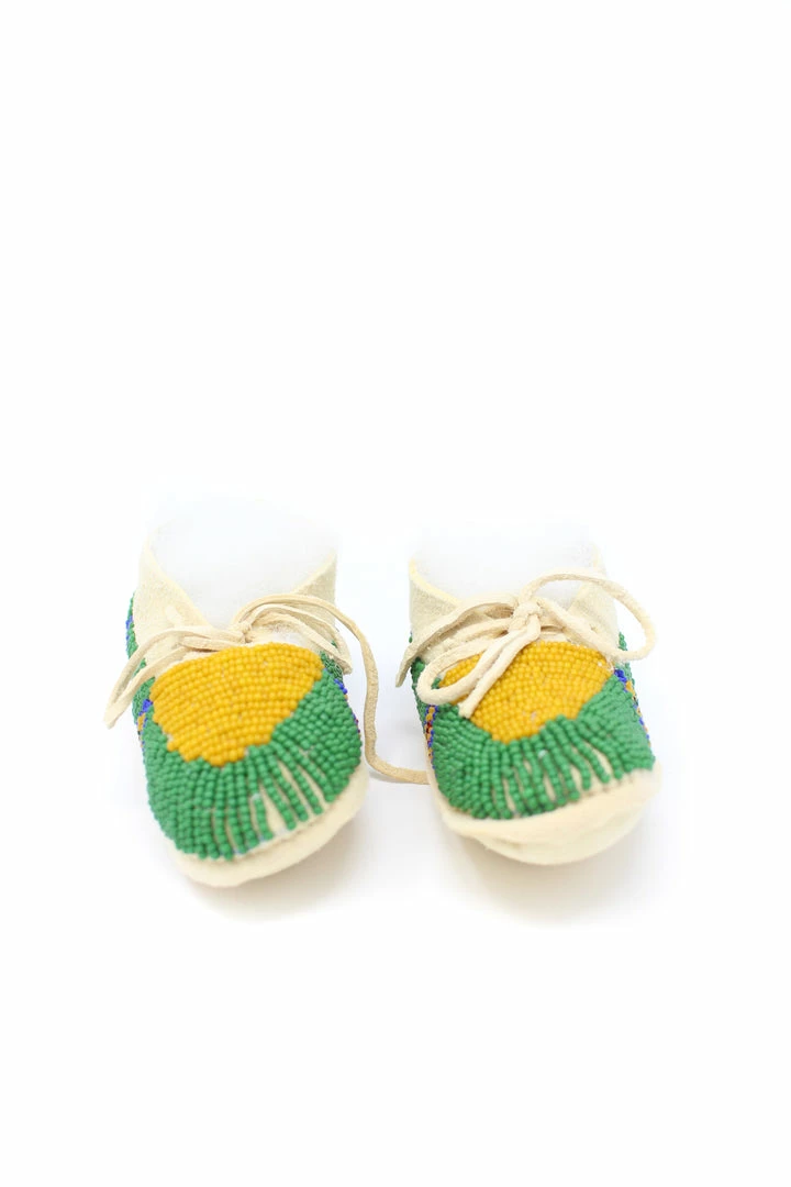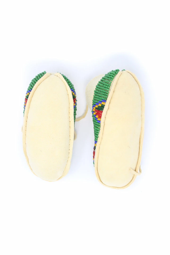 Tanned hide baby moccasins adorned with size 11/0 vintage seed beads.