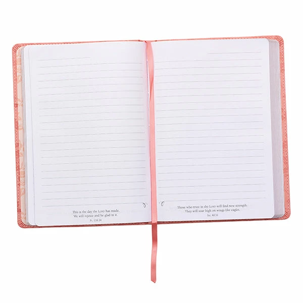 - Journal is 5.75″ x 8.25″ 400 lined, pages with Scripture interspersed