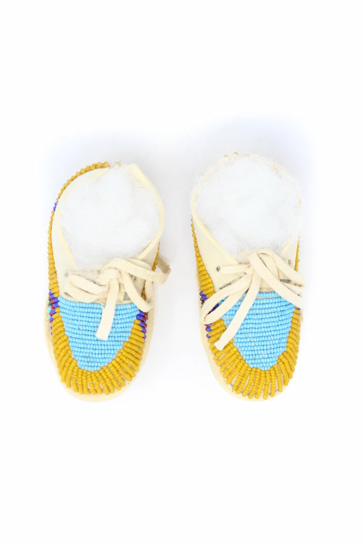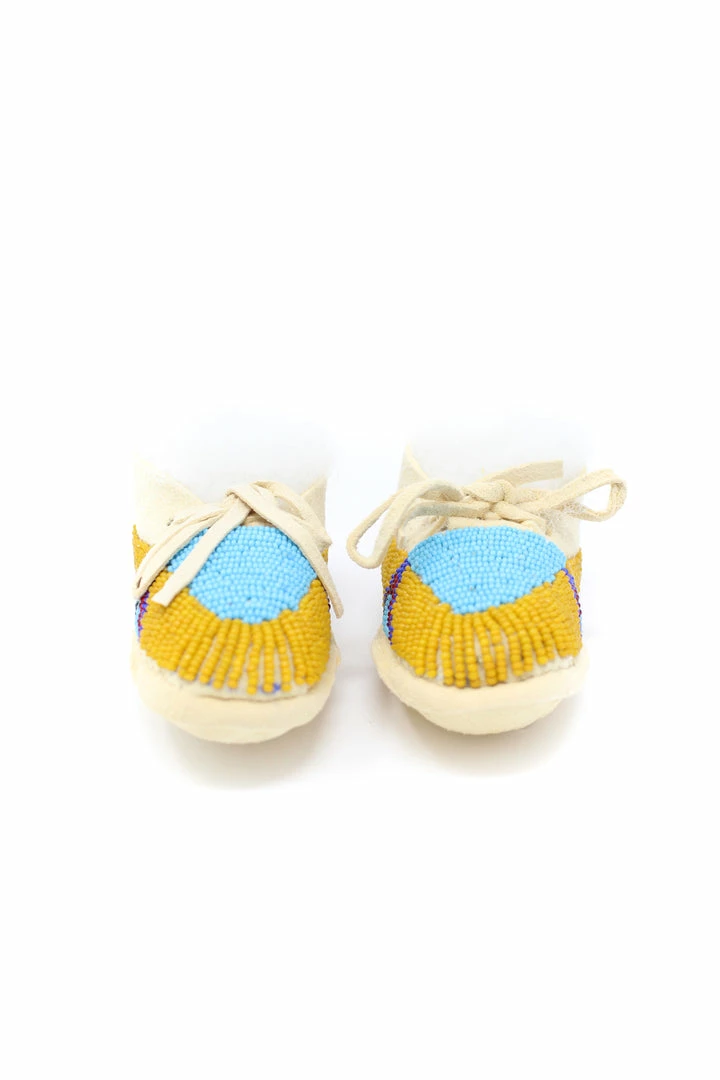 Tanned hide baby moccasins adorned with size 11/0ย vintage seedย beads.ย