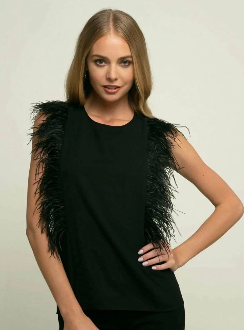 The season less black top you can wear forever. Lovely black crepe fabric with real sustainable sourced ostrich feathers. Key hole back neckline.