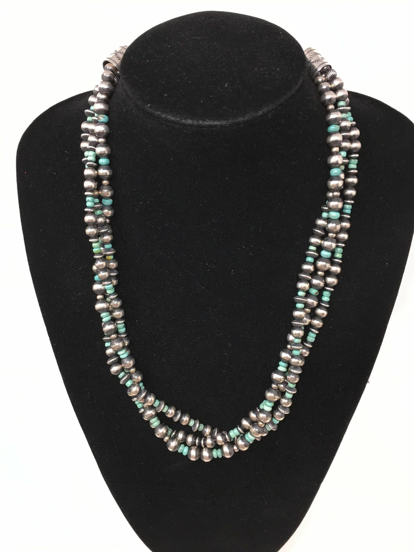 This sterling silver necklace has gorgeous written all over it. Mixed sized sterling silver beads and tuquoise stone beads will have you dazzling the crowds.